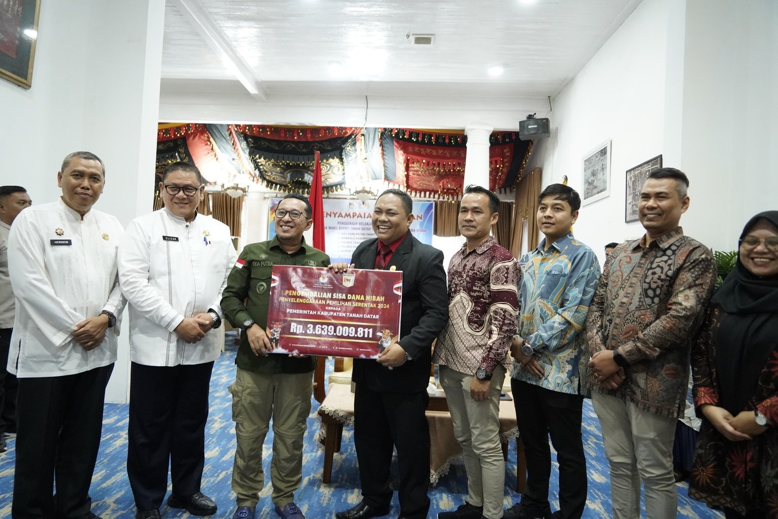 Ketua KPU Tanah Datar Dicky Andrika menyampaikan terima kasih atas dukungan serta kerjasama pemerintah daerah dan semua pihak dalam pelaksanaan pilkada Tanah Datar, sehingga berjalan sukses dan lancar. Adapun sisa dana hibah yang dikembalikan sebesar Rp 3.639.009.811 dari total NPHD yang diterima KPU Tanah Datar sebesar Rp 26.500.000.000.