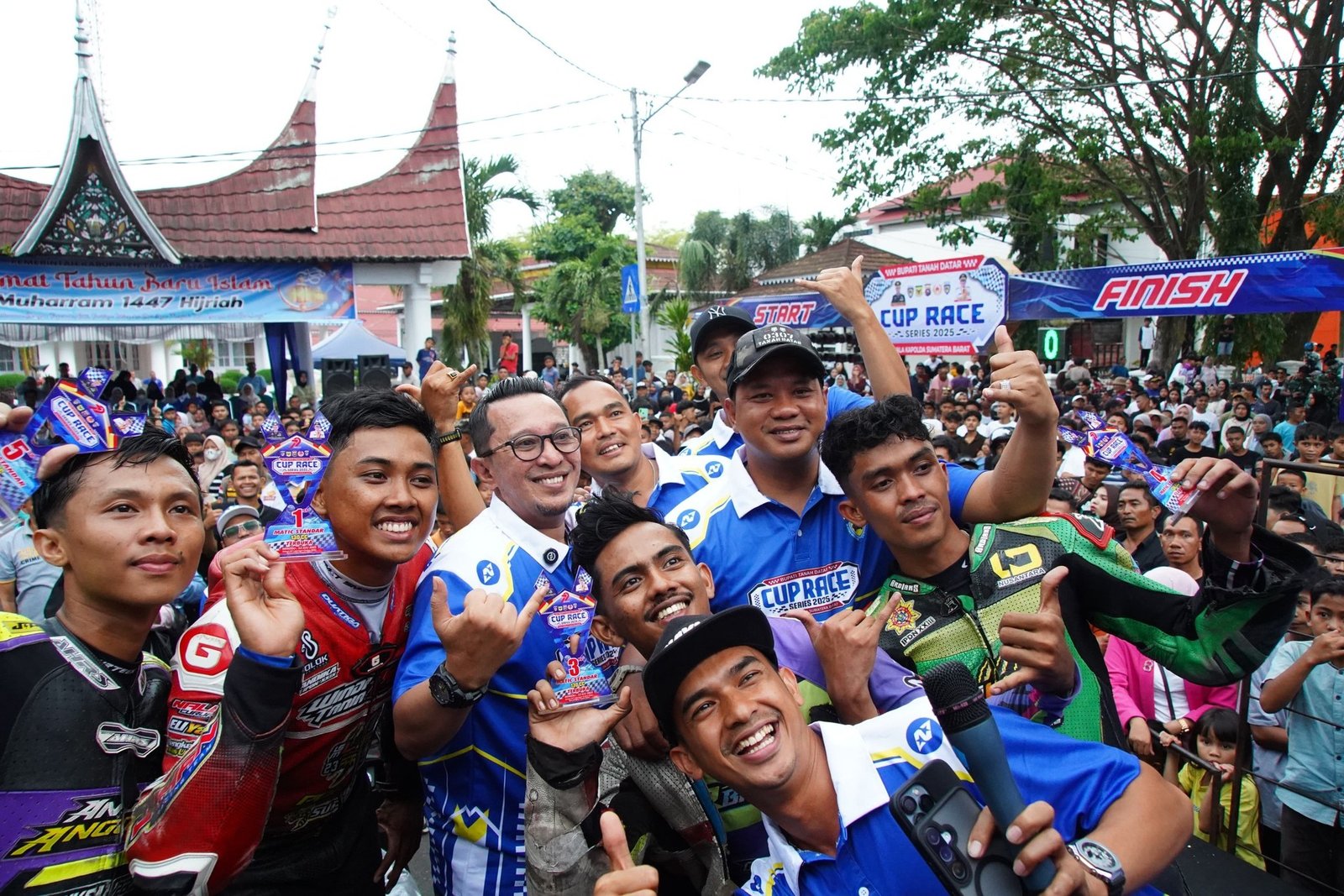 TANAH DATAR – Bupati Tanah Datar Eka Putra, SE, MM didampingi Kapolres AKBP. Nur Ichsan Dwi Septiyanto, Dandim 0307 Letkol Inf. Agus Priyo Pujo Sumedi dan Ketua IMI Tanah Datar Arie Andre JR menyampaikan ucapan terima kasih kepada seluruh pengunjung yang telah menyaksikan Bupati Tanah Datar Cup Race Series 2025.