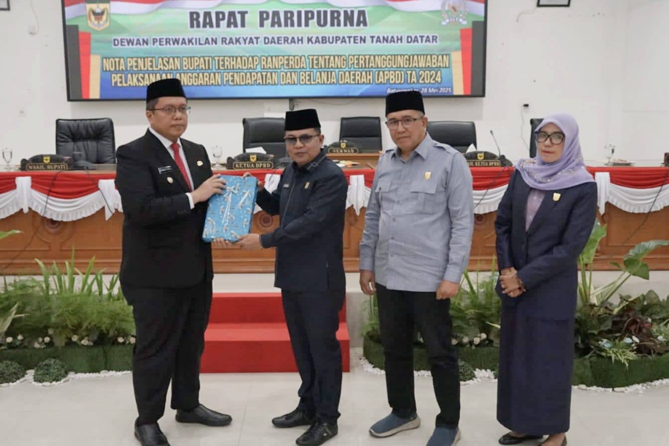 TANAH DATAR – Dewan Perwakilan Rakyat Daerah (DPRD) menggelar rapat paripurna tentang Nota Penjelasan Bupati Tanah Datar atas Penyampaian Ranperda tentang Pertanggungjawaban Pelaksanaan Aggaran Pendapatan Belanja Daerah (APBD) Tahun Anggaran 2024, Rabu (28/5/2025) di ruang sidang DPRD setempat.