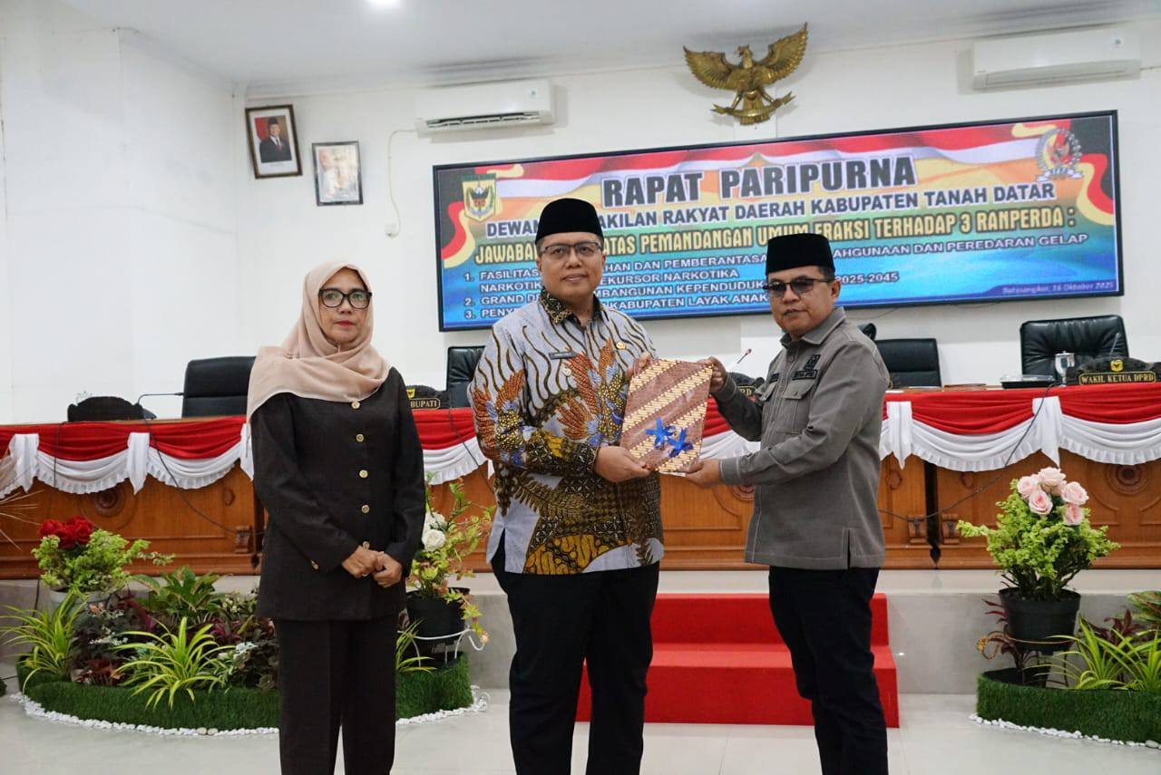 TANAH DATAR – Dewan Perwakilan Rakyat Daerah (DPRD) Kabupaten Tanah Datar menggelar Rapat Paripurna tentang Jawaban Bupati atas Pemandangan Umum Fraksi DPRD terhadap tiga Rancangan Peraturan Daerah (Ranperda), Kamis (15/10/2025) di ruang sidang utama gedung DPRD setempat.