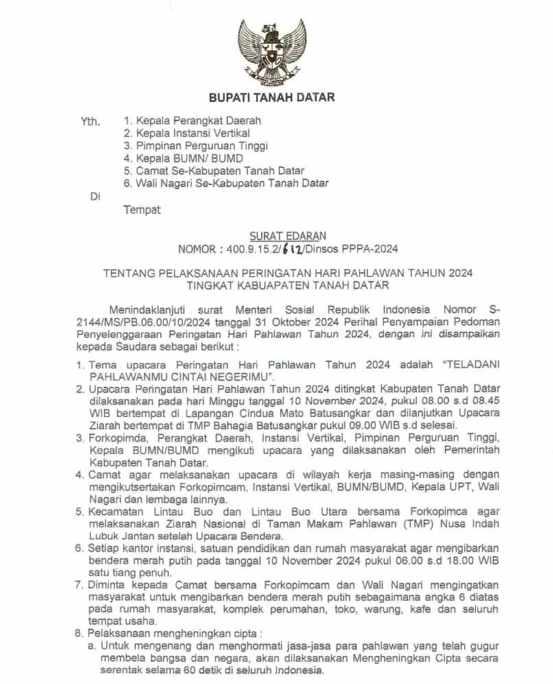 Tanah Datar (CLICK SUARA) – Pemerintah Kabupaten Tanah Datar mengimbau masyarakat untuk memperingati Hari Pahlawan pada 10 November 2024 dengan mengibarkan bendera Merah Putih dan mengheningkan cipta serentak. Hal ini disampaikan melalui Surat Edaran Nomor: 400.9.15.2/612/Dinsos PPPA-2024 terkait pelaksanaan Hari Pahlawan 2024 tingkat Kabupaten Tanah Datar.