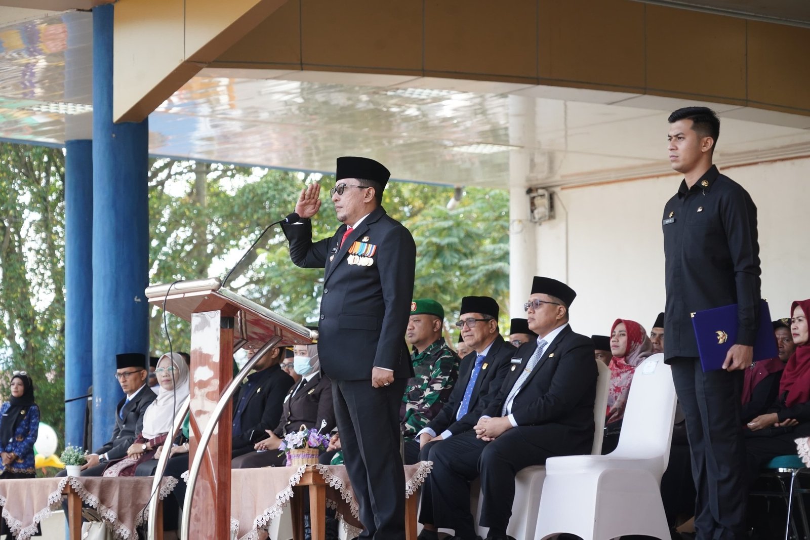Upacara dipimpin langsung Bupati Tanah Datar Eka Putra SE. MM dan dihadiri Wakil Bupati Ahmad Fadly, S.Psi, Forkopimda, Pimpinan DPRD Tanah Datar, Sekretaris Daerah Abdurrahman Hadi S.STP, M.Si, Staf Ahli Bupati, Asisten, Pimpinan OPD, Ketua TP PKK Ny Lise Eka Putra, Ketua GOW Ny Dwinanda Ahmad Fadly dan undangan lainnya.