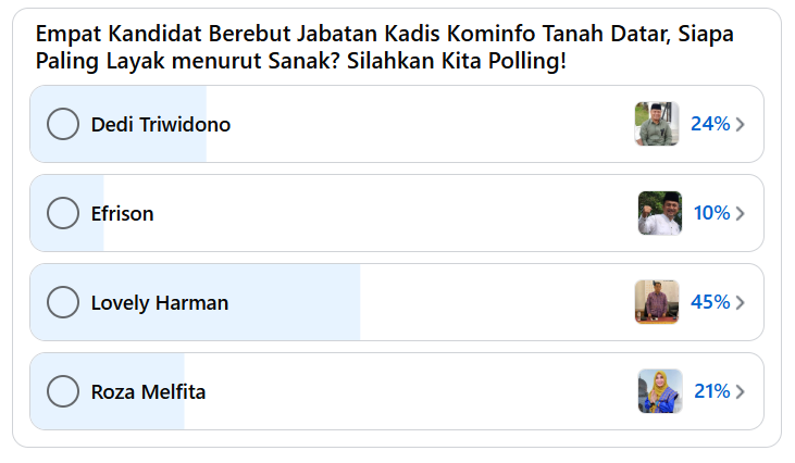 Polling warganet ini tidak bersifat resmi, namun mencerminkan dinamika opini publik terkait siapa figur yang dianggap paling layak menakhodai Dinas Kominfo Tanah Datar ke depan. (*)